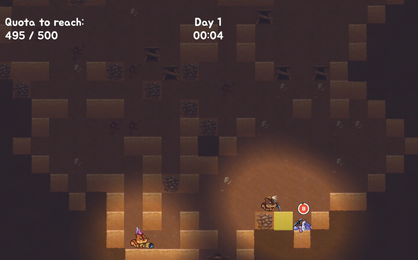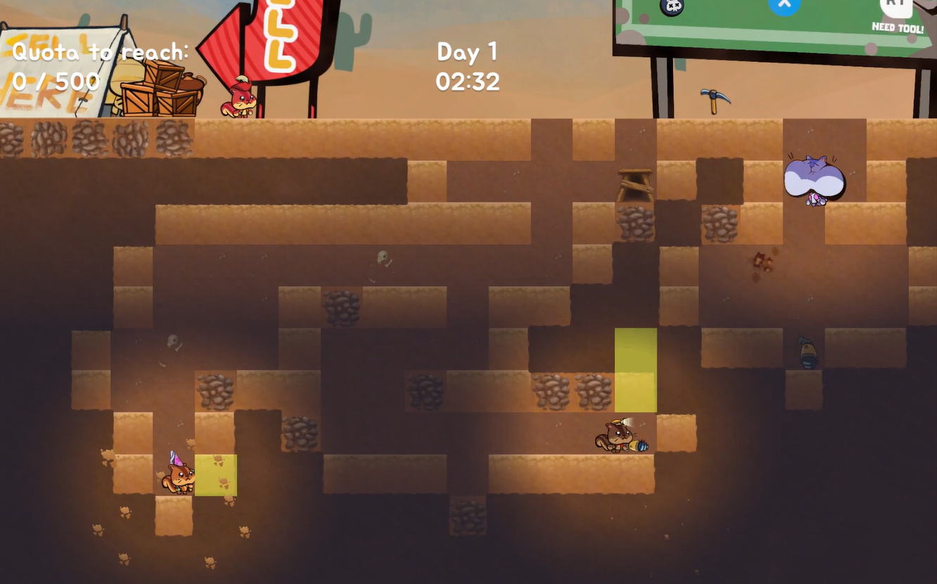 When you pick up an artifact you double in size! Work together to dig each other out to meet your daily quota!
